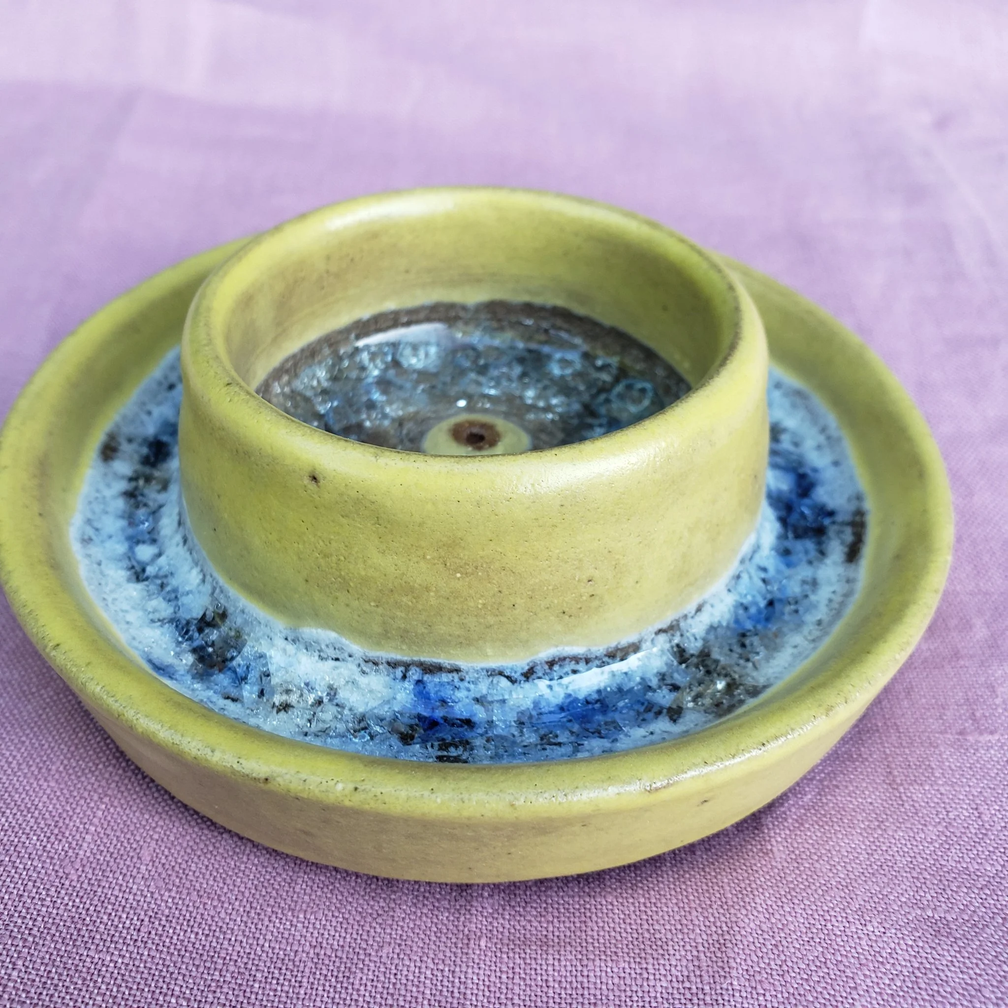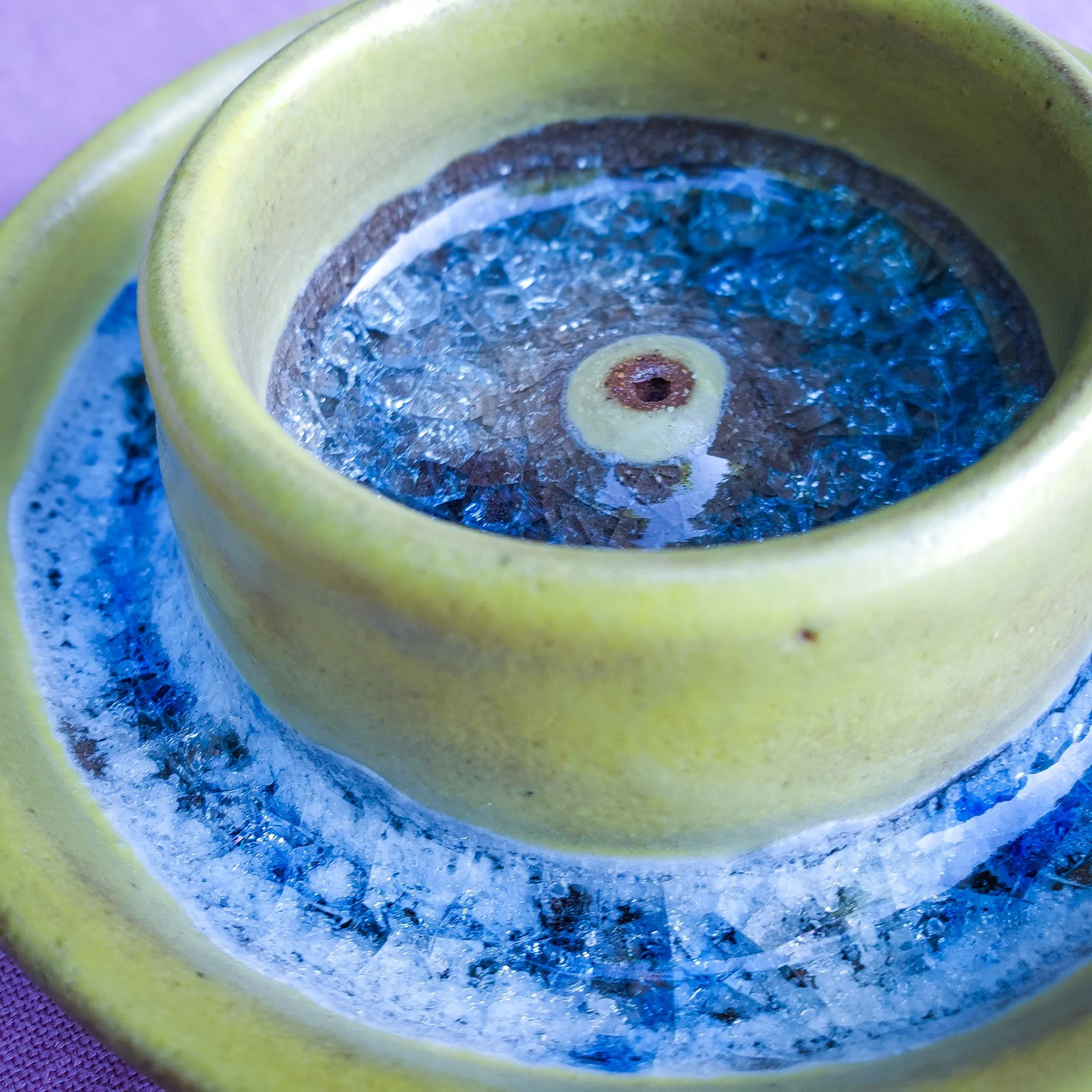 Like a sunlight kissed ocean, the effect of the vintage marbles melted into the double bowl incense burner is eye-catching. This one of a kind burner was wheel thrown with a warm brown clay and glazed with a green tinted yellow satin glaze.
